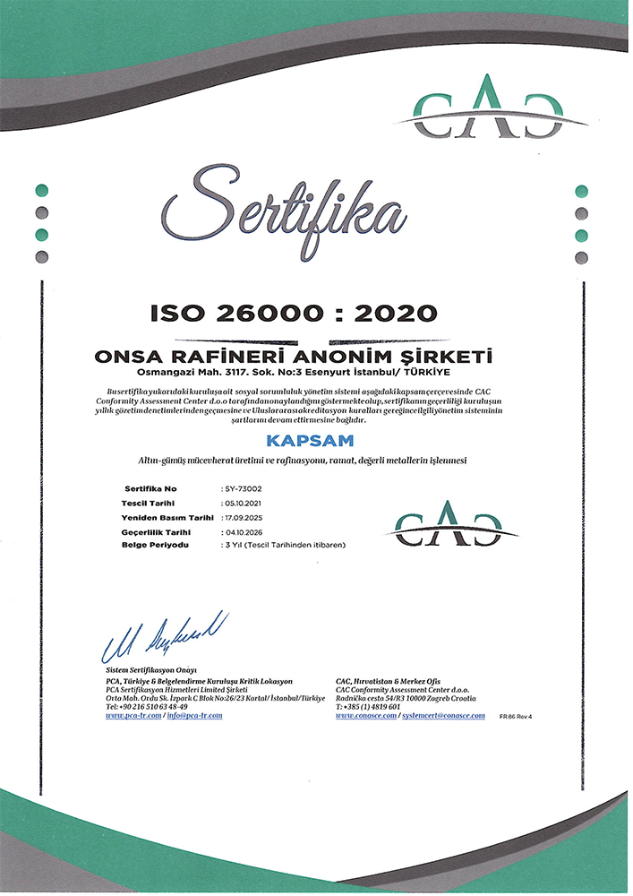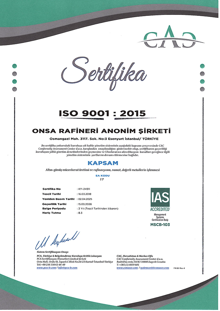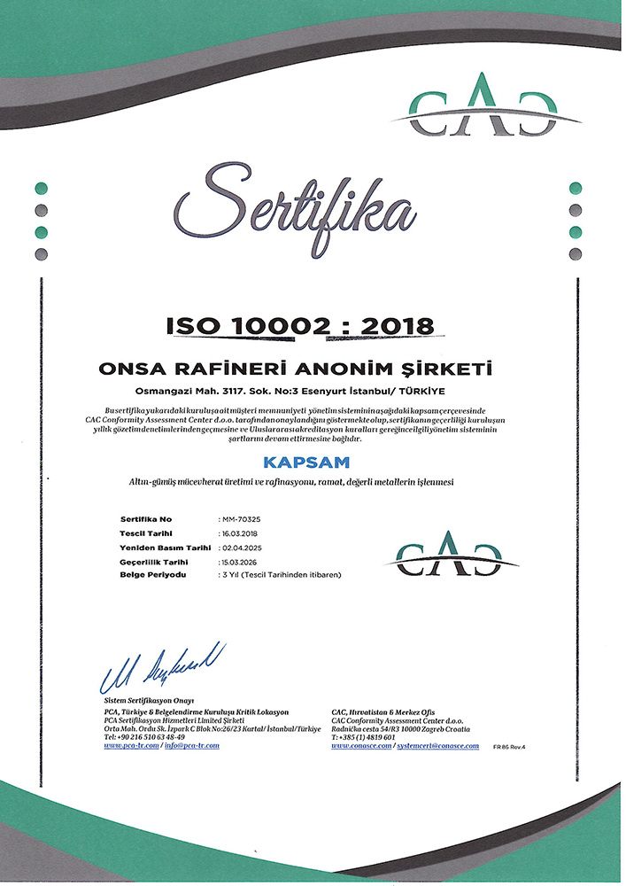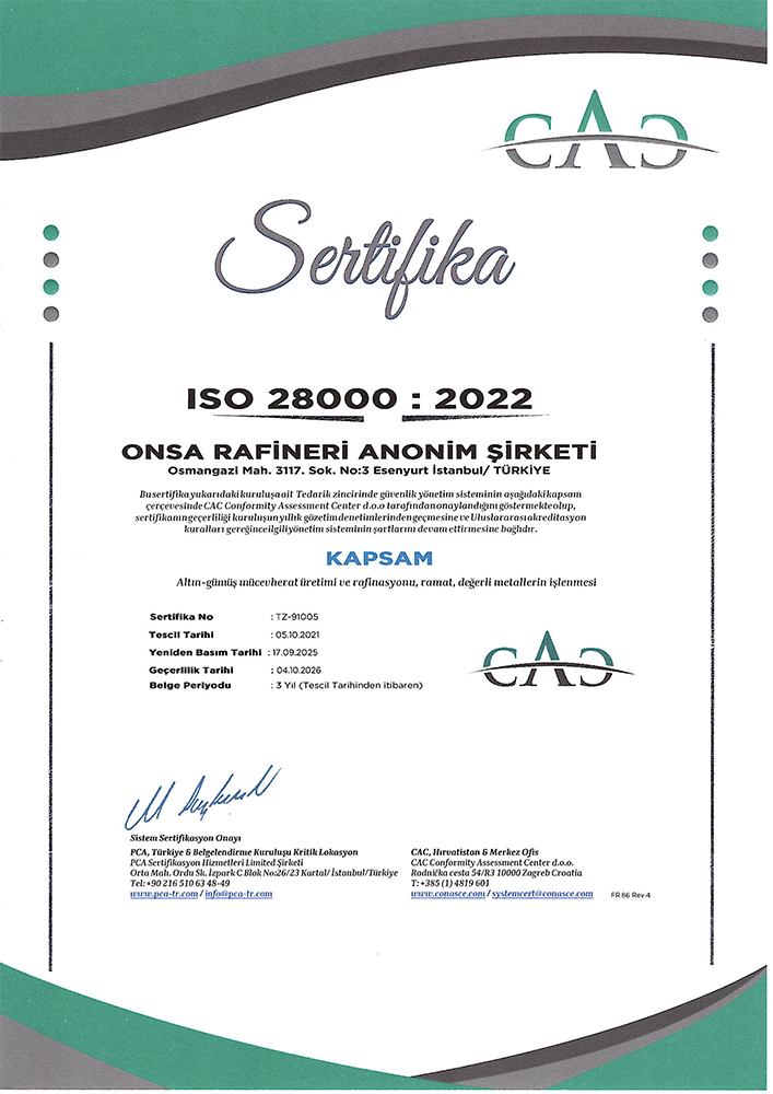 ONSA Rafineri olarak küreselleşen pazarda bir dünya şirketi olmak için müşteri ihtiyaç ve beklentilere cevap verecek şekilde, tüm çalışanların katılımı ile sürekli iyileştireceğini taahhüt ederiz.